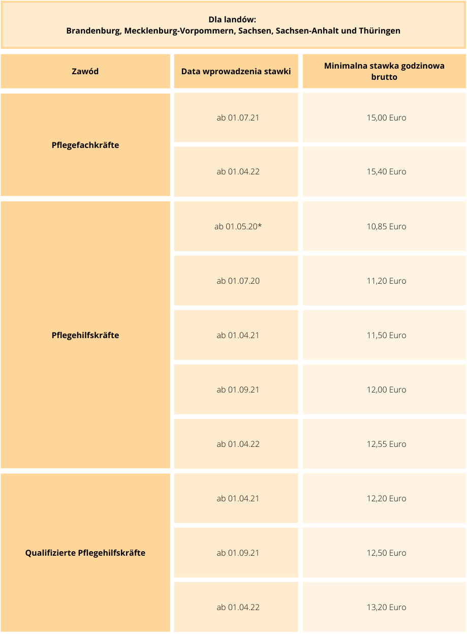 Zarobki Pflegefachfrau/Pflegefachmann (Altepflegerin i Altenpfleghelferin) i Pflegehilfskräfte oraz Qualifizierte Pflegehilfskräfte podlegają zupełnie innym uregulowaniom niż praca Haushaltshilfen für pflegebedürftige Person, które wykonują pracę w miejscu zamieszkania podopiecznego. Dla tych zawodów istnieją odrębne tabele taryfowe związane z wynagrodzeniem minimalnym. Stawki mogą się różnić w zależności od landu, w którym jest zatrudnienie – to nie są stawki federalne. Od września 2022 roku przewidziano kolejne podwyżki, następne są zaplanowane na maj i grudzień 2023 roku. Docelowo w 2023 roku minimalne zarobki opiekunki w domu opieki mają wynosić przy 40-godzinnym tygodniu pracy 3.174 euro brutto (personel wykwalifikowany) i 2.461 euro brutto (personel niewykwalifikowany). Obecnie obowiązują jeszcze następujące stawki: