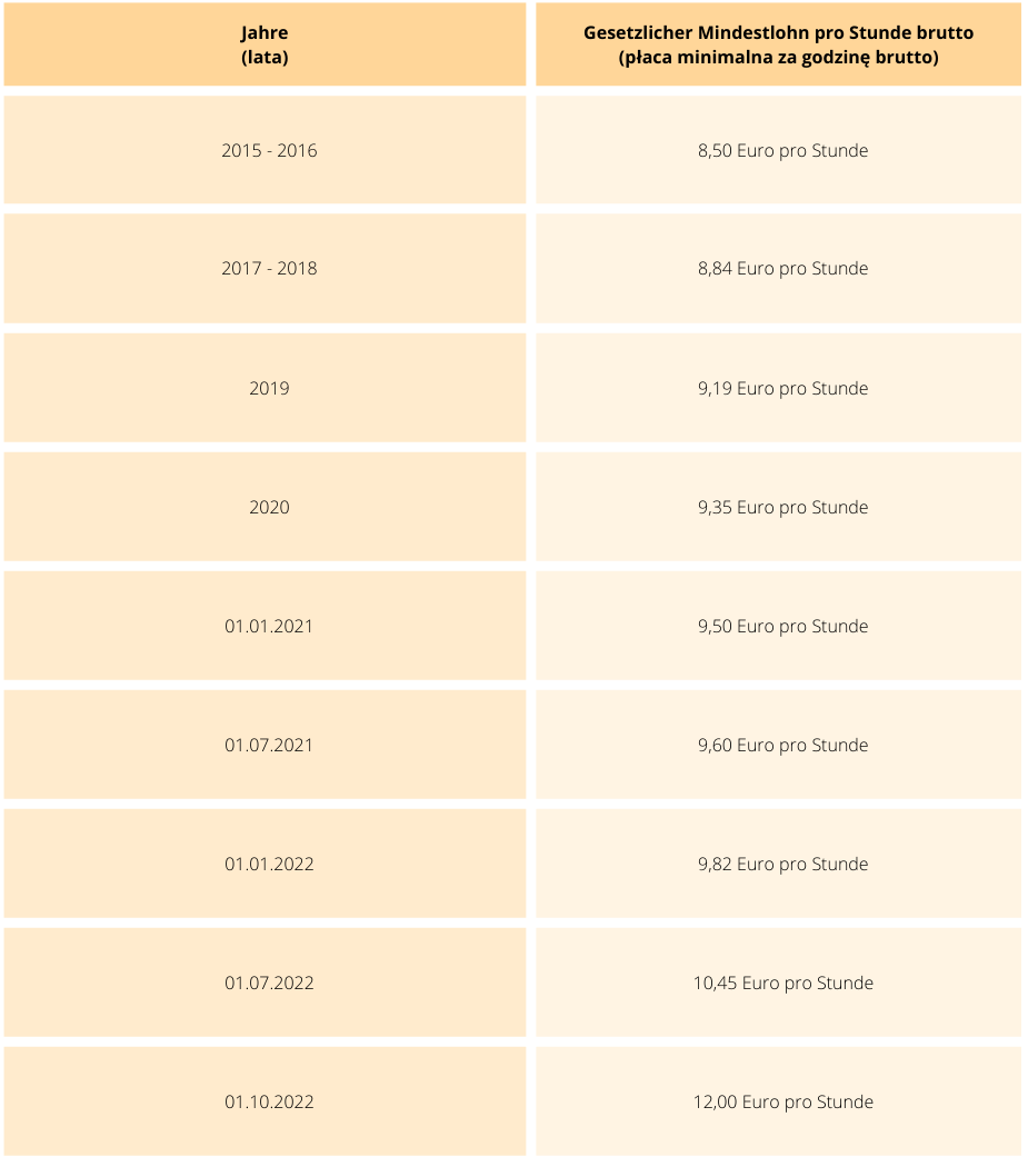W Niemczech tak jak w każdym państwie są pracodawcy, którzy oferują najniższe z możliwych wynagrodzeń jak i tacy, którzy oferują stawki rynkowe. Co do zasady jednak większość pracodawców musi dostosować minimalne wynagrodzenie do stawek wynikających z MiLoG, także firmy zatrudniające opiekunki domowe osób starszych. Jak wyglądały i jak będą wyglądać płace minimalne, obrazuje poniższa tabela: